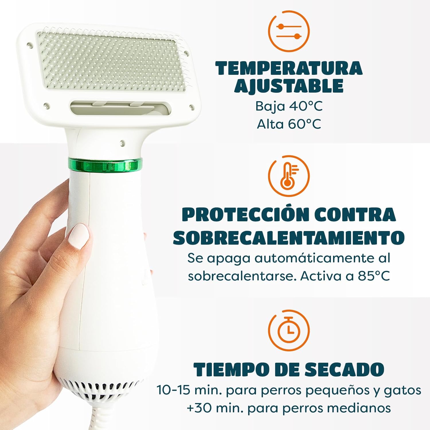 ¡Diseño 2 en 1, aseo fácil para mascotas en casa! El peine está hecho de acero inoxidable 304 con puntas recubiertas. Es ecológico, flexible y duradero, puede proteger la piel y el cabello de las mascotas, incluso masajeándolas mientras tanto. 2 ajustes de temperatura: puede controlar el calor con precisión. Baja temperatura primero, una vez que se adaptan a este nivel de temperatura, luego alta temperatura para un secado rápido. No se preocupe por problemas de enfermedad Aseo rápido: el secador de pelo para perros 2 en 1 es perfecto para el cuidado de mascotas. Cuando las mascotas acaben la ducha o tengan un paseo lluvioso, use nuestro secador de pelo de aseo, más conveniente y ahorra tiempo. Perfecto para un regalo. Usuario amigable Portátil ergonómicamente diseñado para sujetarlo en la mano. Fácil de almacenar, rápido y eficiente justo después del baño. Seguro para mascotas: hay una cubierta de filtro de pelo en la parte inferior, que puede proteger el secador de quemaduras por bloqueo de pelo. Gire a la izquierda para abrirlo y simplemente limpie la esponja después de usarla, muy fácil de limpiar el pelo de las mascotas.